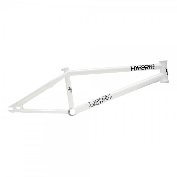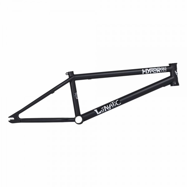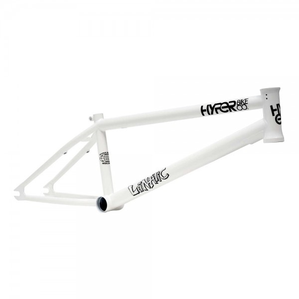 The 20.8in Hyper Lunatic is Brandon Loupos’s signature frame made from 4130 super thermo butted chromoly tubing featuring an integrated headtube, drilled gyro tabs, top tube and downtube gussets for strength, Mid BB shell, integrated seat-post clamp, removable U-brake mounts, Hyper logo seat-stay bridge, and 5mm thick heat-treated investment cast dropouts.