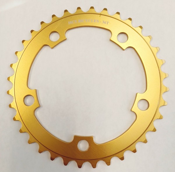 The MCS USA 5-Bolt pattern chainring is an all american cnc machined product made of 6061-T aluminum. It features an almost perfect round circumference, which will facilitate achieve an even tension of your chain. 110mm hole pattern.