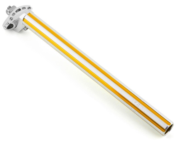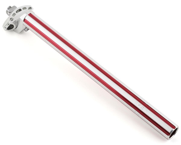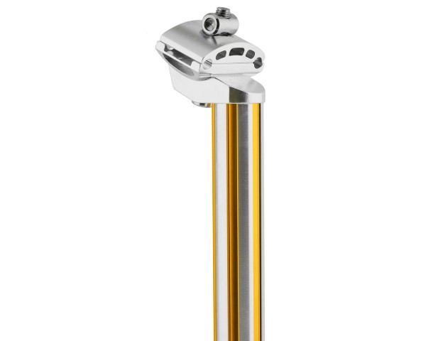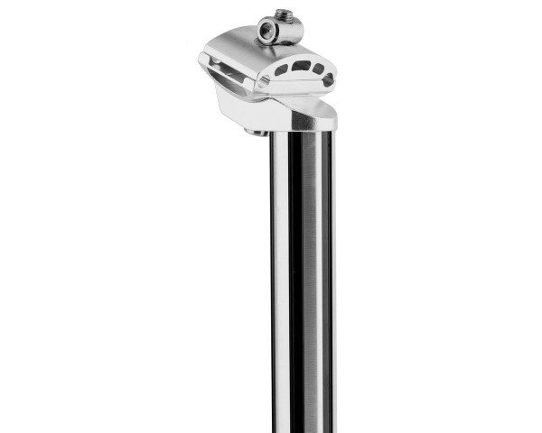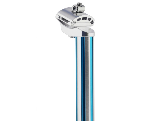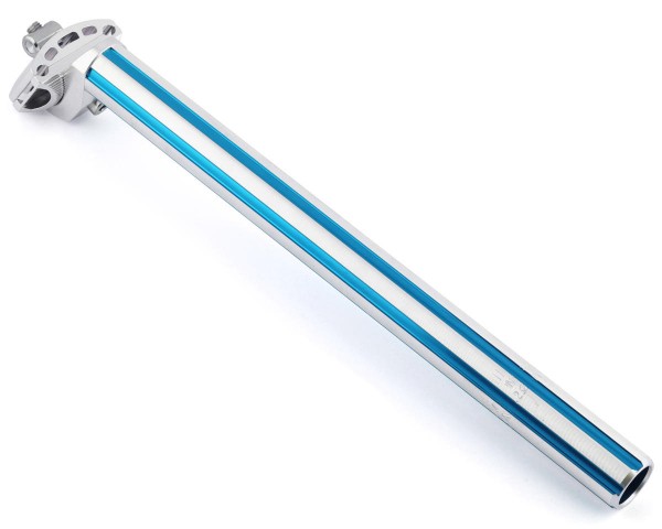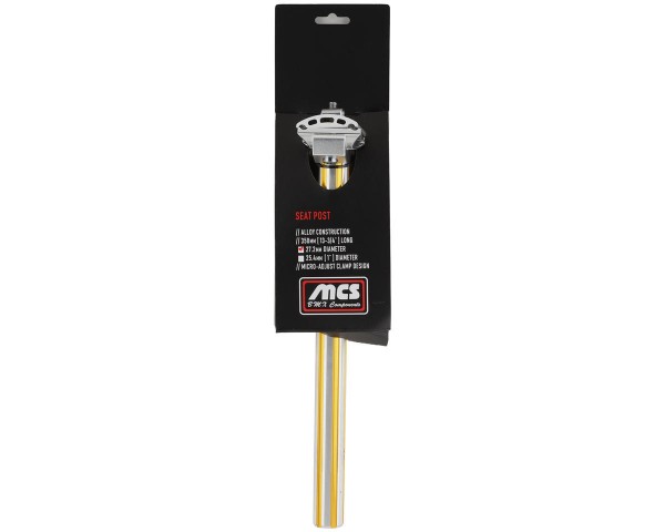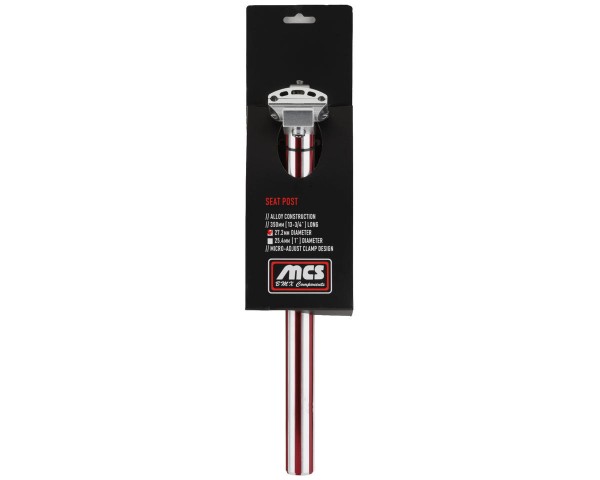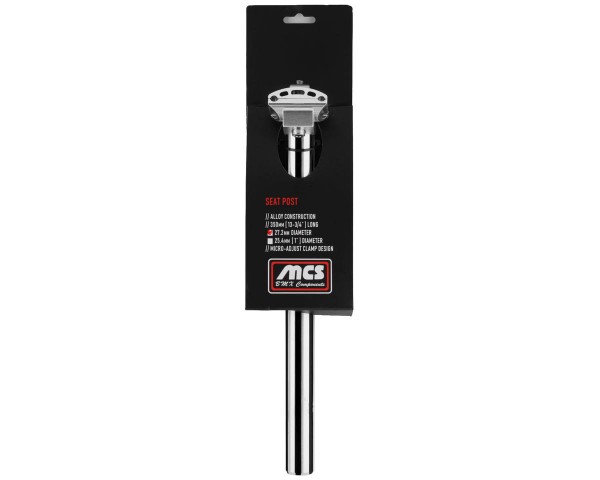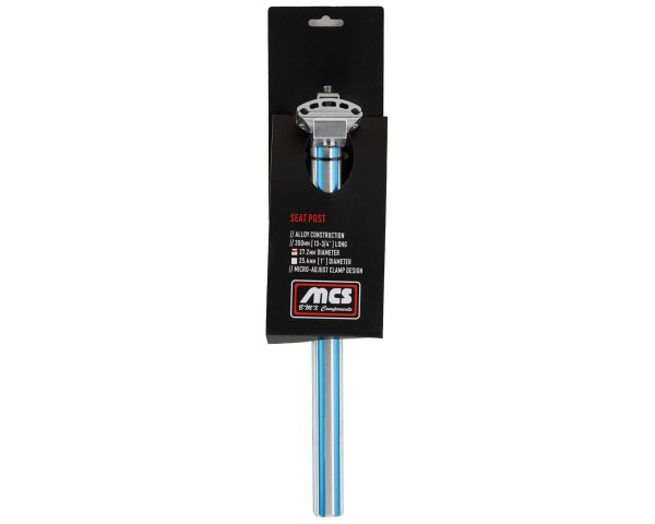 MCS newest alloy construction seat post for railed seats, featuring a micro-adjust clamp design and a fluted anodized finish.
