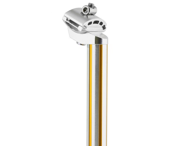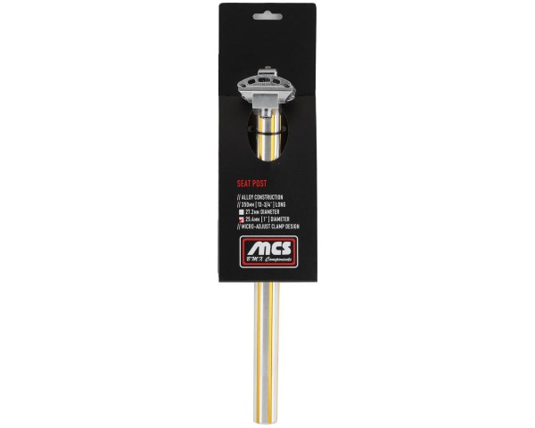 MCS newest alloy construction seat post for railed seats, featuring a micro-adjust clamp design and a fluted anodized finish.