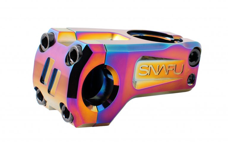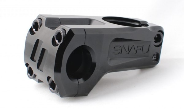 The Snafu V2 Front Load Magical Stem is Harry Main Signature design, featuring a single 52mm reach and a front-loading bar clamp. It is available in two colors, Black & Jet Fuel.