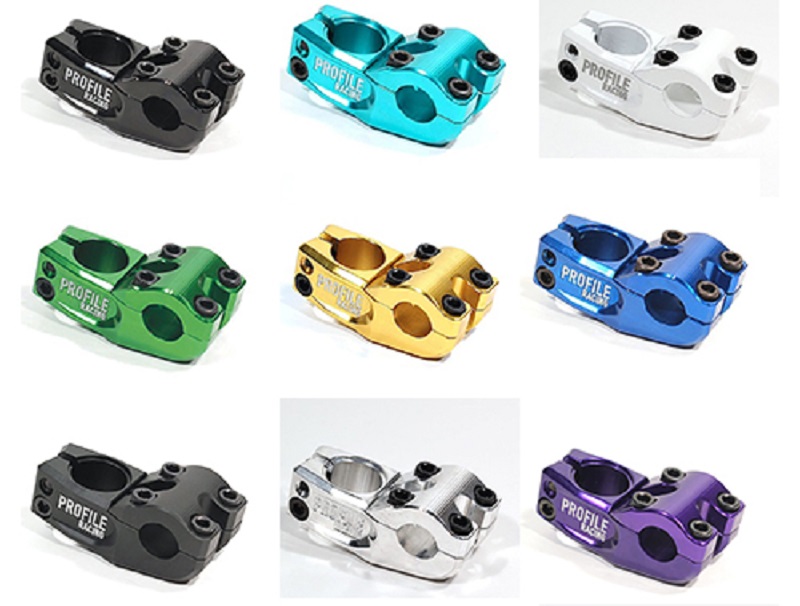 The Profile “Push” stem is named after Mark’s favorite trails. It locates bars 23mm (.9 inches) higher than the Acoustic Stem. It is available in 4 different sizes 48mm, 53mm, 58mm, 63mm and 10 different colors Black, Blue, Camo (48mm & 53mm only), Gold, Green, Matte Black, Polished, Purple, Red & White.