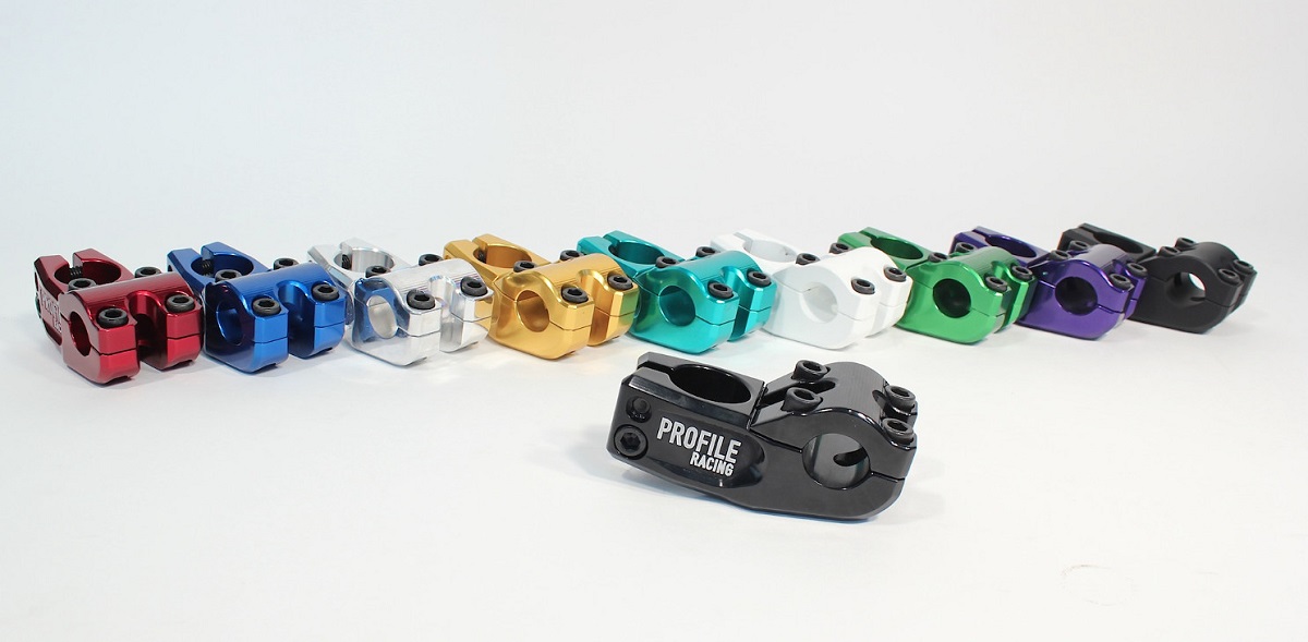 The Profile “Push” stem is named after Mark’s favorite trails. It locates bars 23mm (.9 inches) higher than the Acoustic Stem. It is available in 4 different sizes 48mm, 53mm, 58mm, 63mm and 10 different colors Black, Blue, Camo (48mm & 53mm only), Gold, Green, Matte Black, Polished, Purple, Red & White.