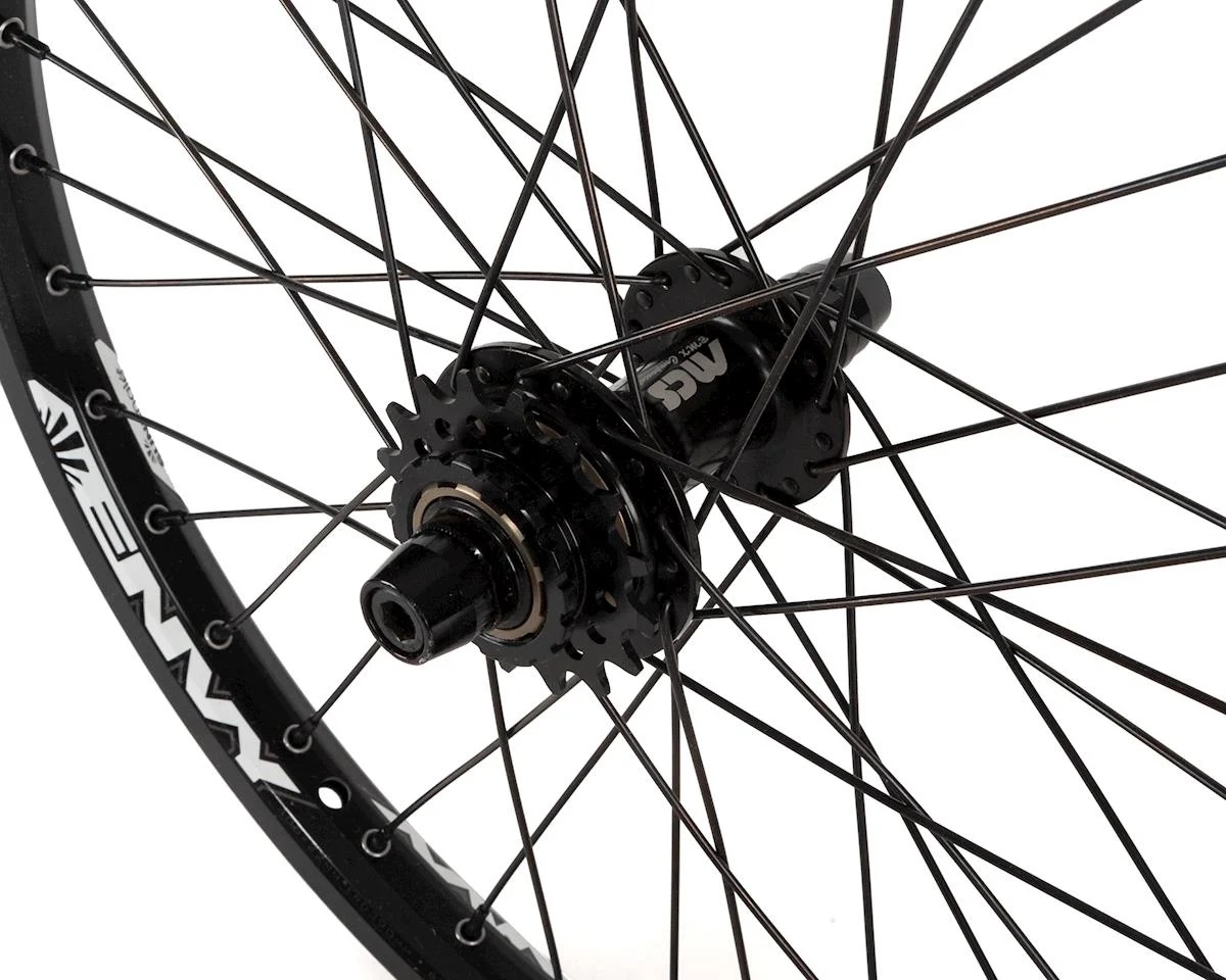 Finally an affordable, lightweight, reliable and elegant Pro size cassette wheelset featuring great components like the MCS Cassette hubs with an outstanding 120 points of engagement with 6 pawls, laced professionally with Stainless Steel black spokes and brass black nipples to matching color Sun Ringle Envy 20x1.75" rims. Includes an aluminum MCS 16T cog. This wheelset is available in three colors.