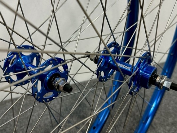 - Blue anodized alloy Race Inc. hubs with alloy dust cover cone nuts